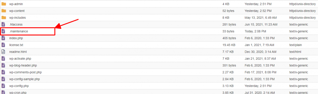 Khi quá trình cập nhật bắt đầu, WordPress tạo file .maintenance tại thư mục gốc (root) chứa trang.