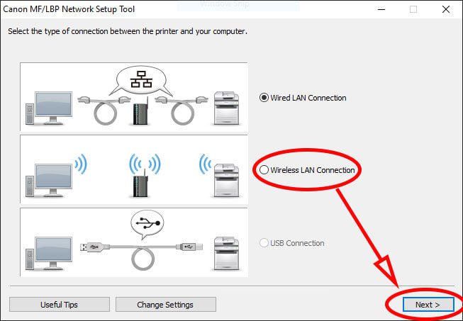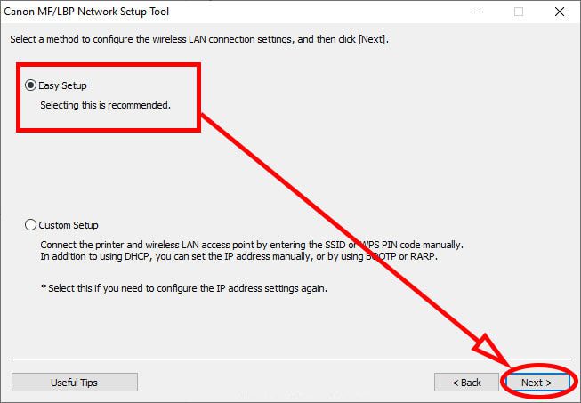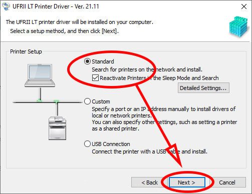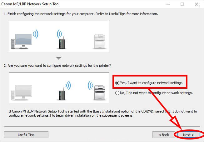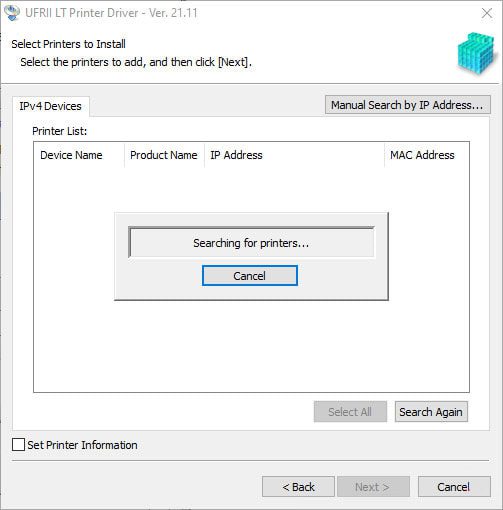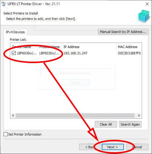 *Nếu trình cài đặt không dò được máy in wifi, bạn hãy nhấn Back trở lại 1 lần rồi nhấn Next để dò lại.