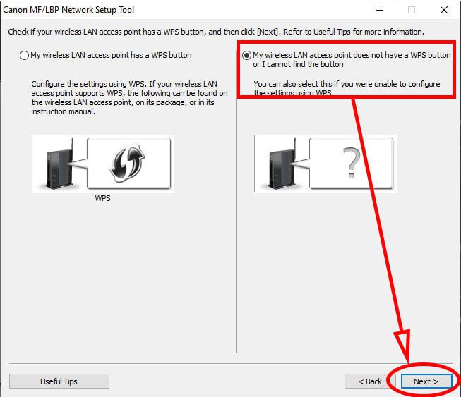 Bước 3: Chọn “Yes” > “Easy Setup” > “My wireless LAN access point does not have a WPS button or i cannot find the button