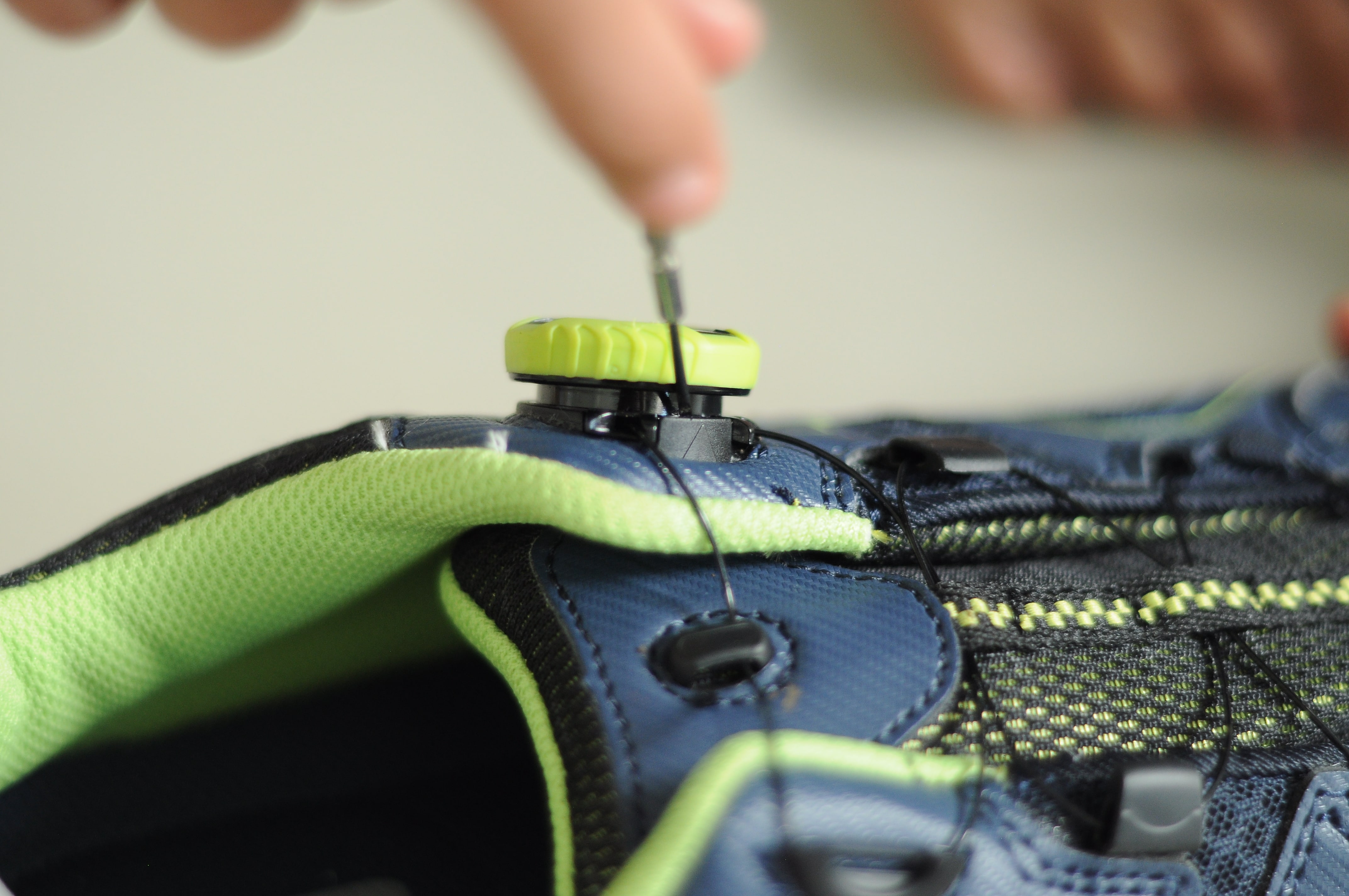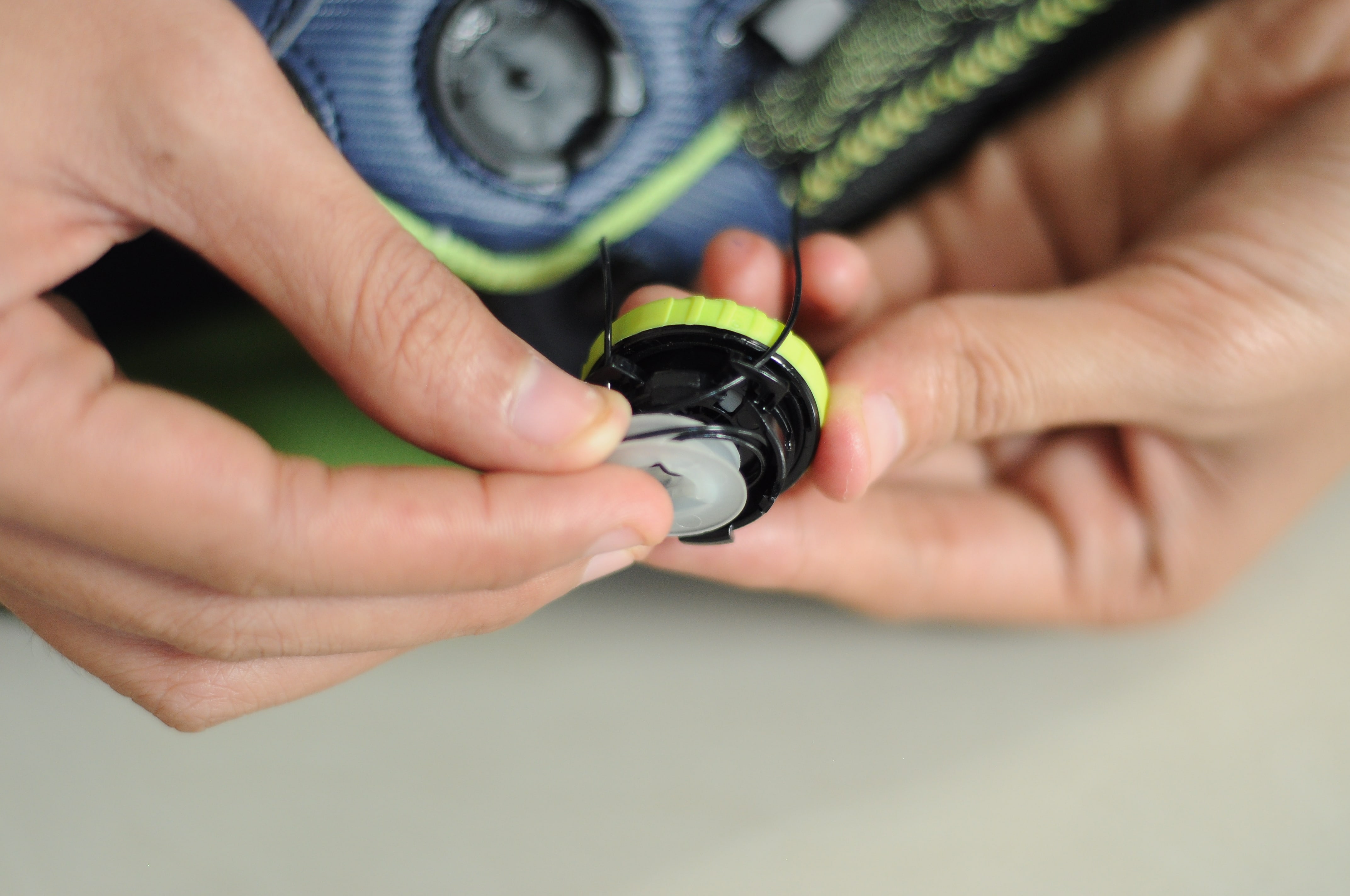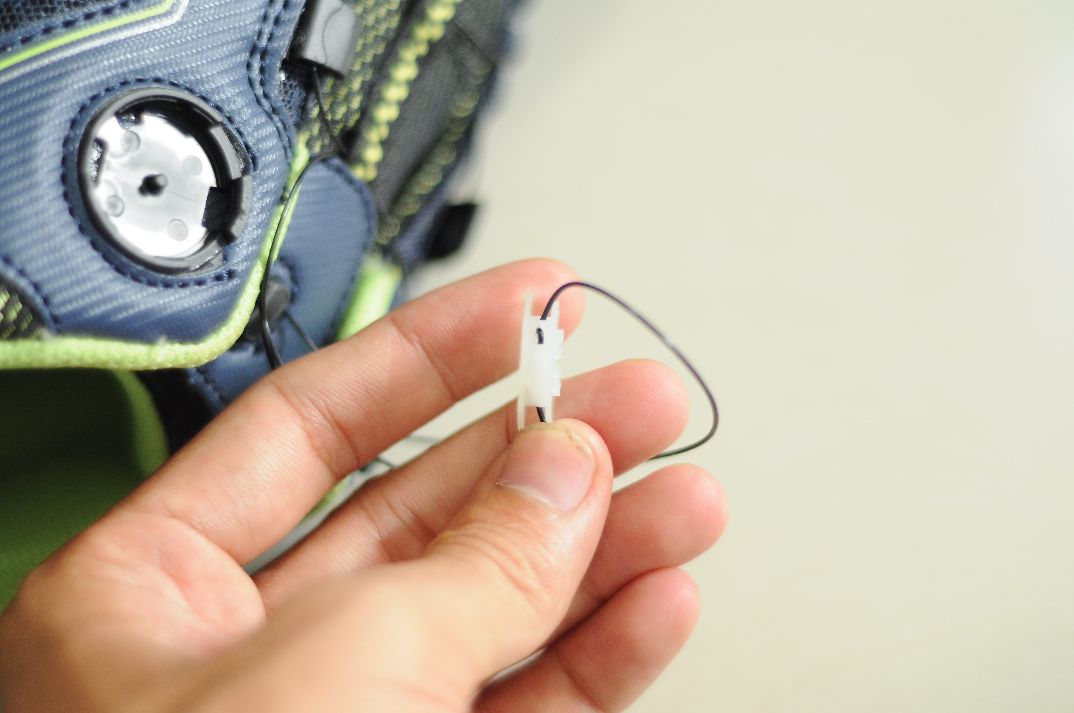 Dùng kìm cắt đoạn dây mới bằng chiều dài đoạn dây cũ. Xỏ lại dây vào giày, bộ chỉnh dây và trục quấn dây như cũ